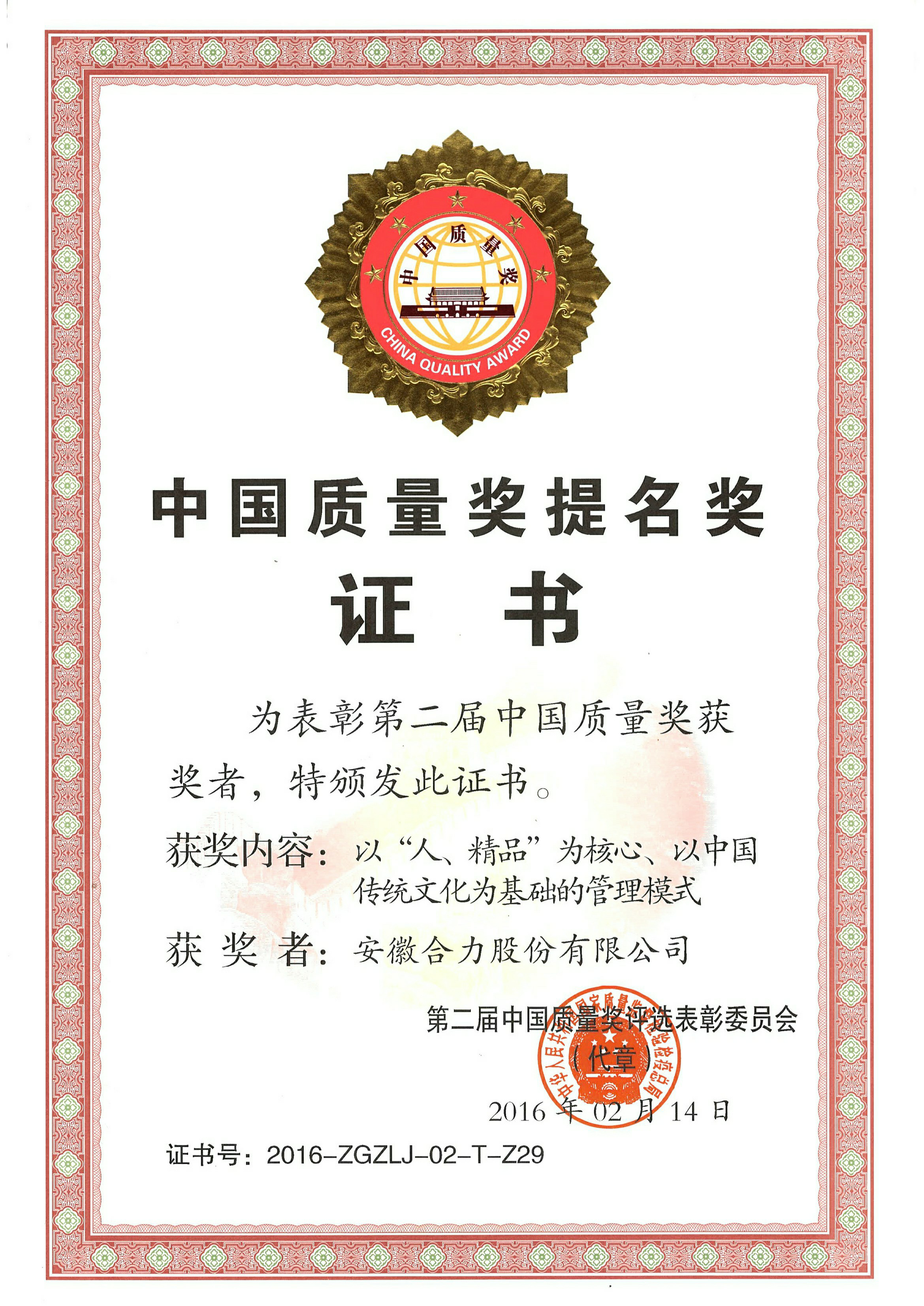 2016 第二屆中國(guó)質(zhì)量獎(jiǎng)提名獎(jiǎng)