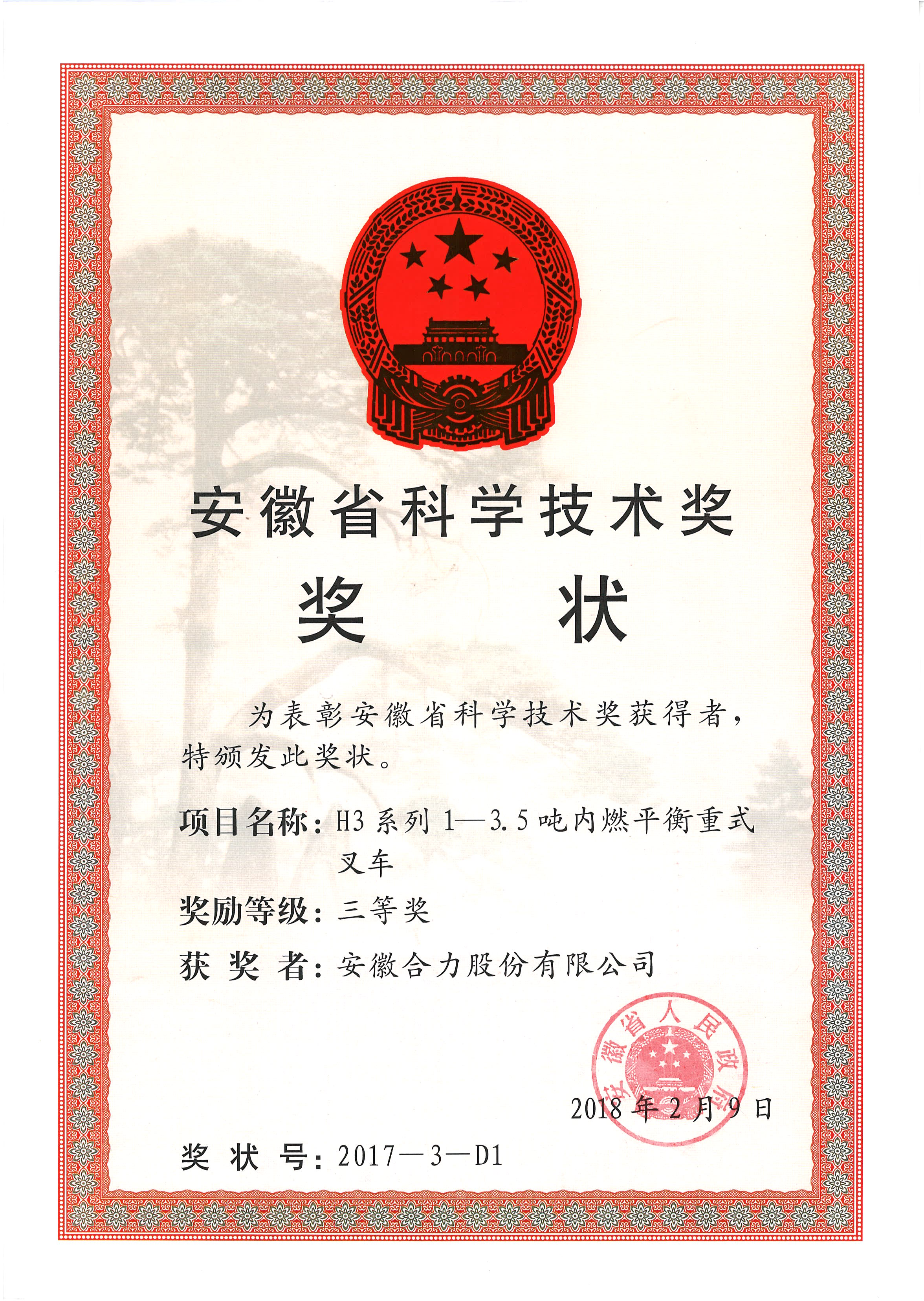 2018 安徽省科學(xué)技術(shù)獎(jiǎng)三等獎(jiǎng) H3系列1-3.5噸內(nèi)燃平衡重式叉車