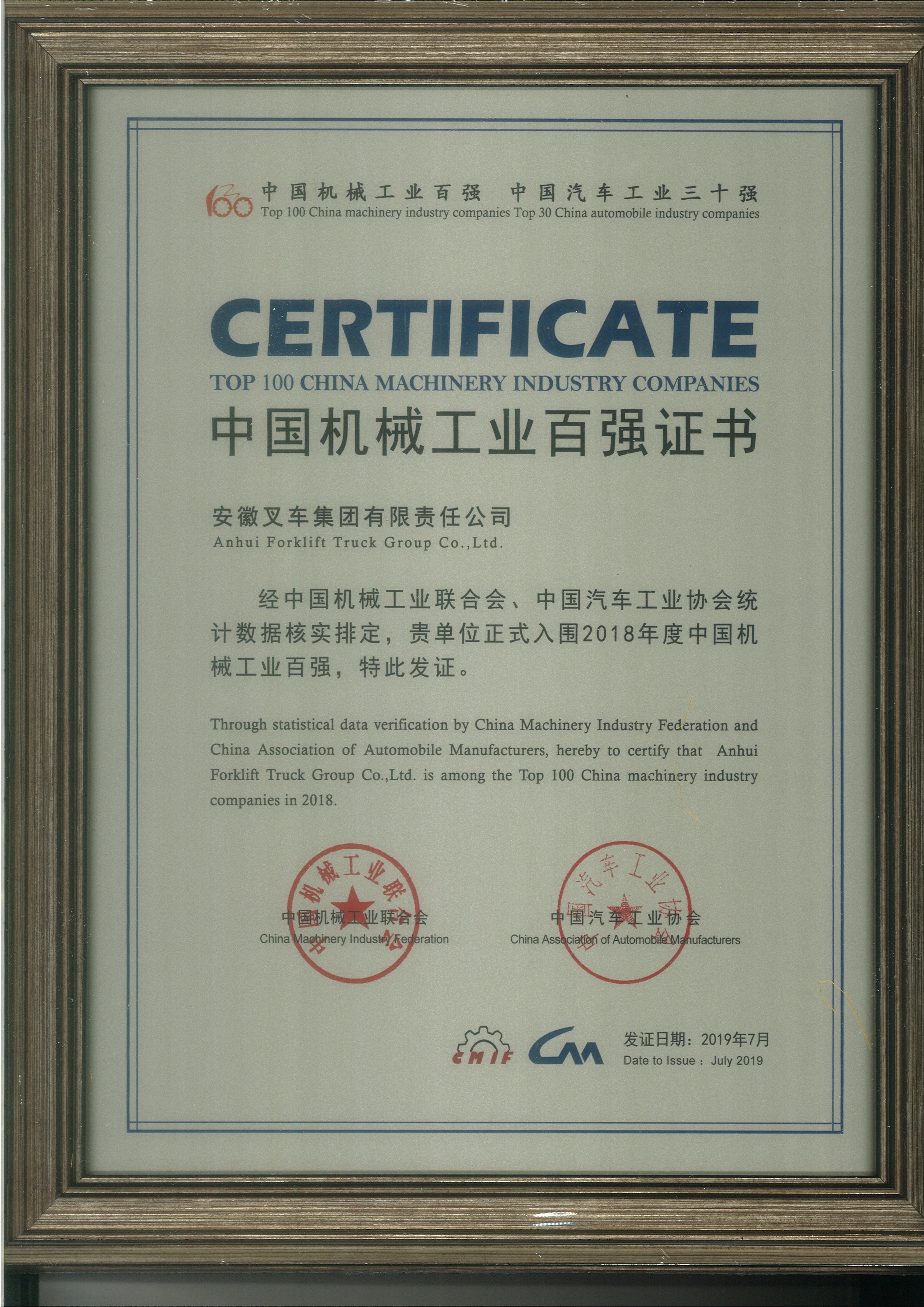 2020 中國(guó)機(jī)械工業(yè)百?gòu)?qiáng)證書